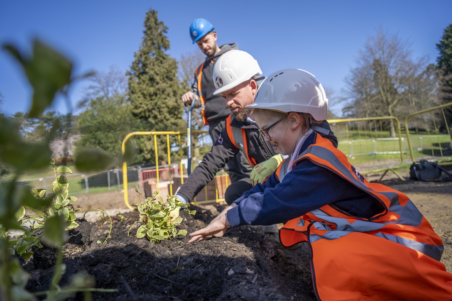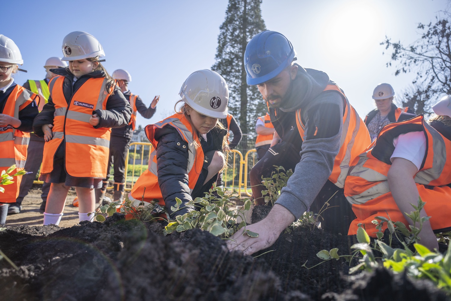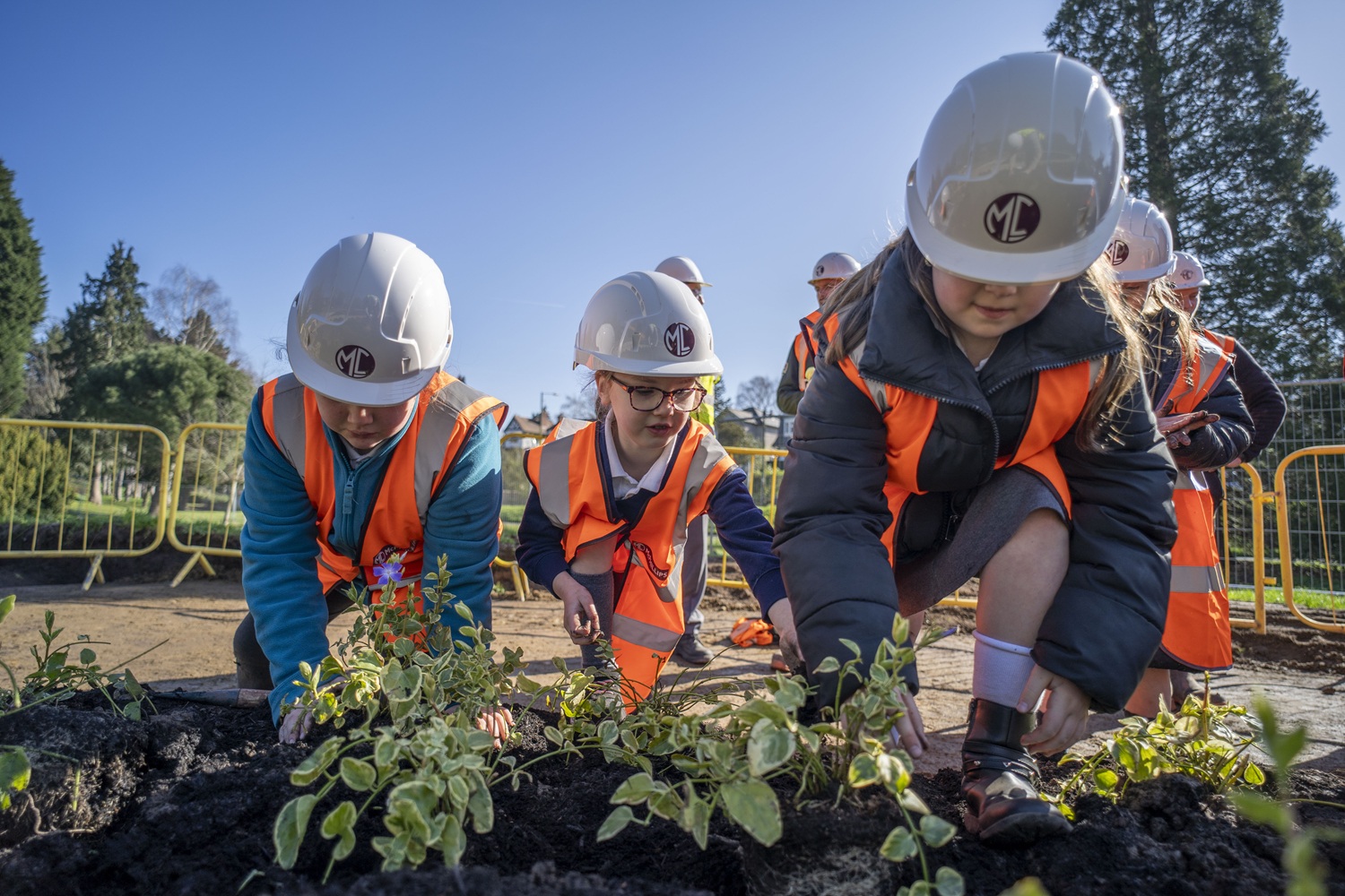 Members of the school's council joined forces with contractors McPhillips to plant periwinkles around the new ornamental pool, contributing hands-on to the park's ongoing improvement project.